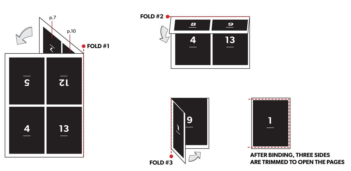 That way, when the book is printed, the layout is in the correct order when the pages are folded and cut. Like this . . .